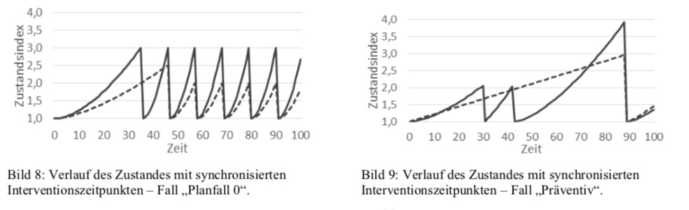 Dann müssen wir aber die Konsequenzen für die weitere Zustandsentwicklung, die neuen möglichen Interventionen, Interventionszeitpunkte und deren jeweilige Kosten bestimmen können. Die folgende Abbildung zeigt die markanten Unterschiede der Zustandsentwicklung (durchgezogene Linie) bei einer Zustandsbasierten (links) und einer präventiven Strategie (rechts). Die Maßnahmen bzw. Aufwände sind strichliert dargestellt.