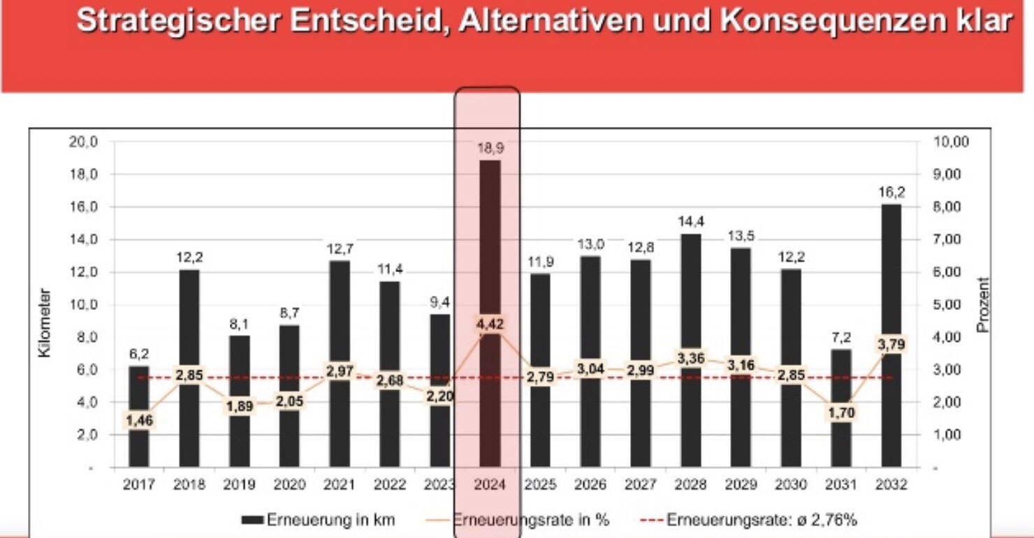 Bei den Wiener Linien haben wir das im Programm Gläserner Fahrweg ab 2014 für die Instandhaltungskosten umgesetzt. Dabei wurde der reine Erneuerungsbedarf auf Basis der drei Faktoren Einbaujahr, Lastkollektiv und Geometrie ermittelt. Eine rückwirkende Bewertung der LCC und Feststellung der damaligen Investkosten wurde nicht gemacht. Der Aufwand ist zu hoch, die resultierenden Werte sind mit Unsicherheiten behaftet und bieten kaum Nutzen. Die Betrachtung bezieht sich also auf die Restliegedauer und anstehende Erneuerungen.