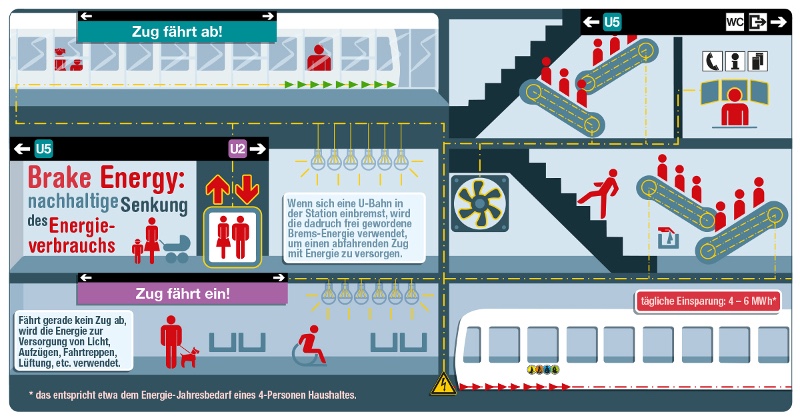 Unser U-Bahn Netz ist sehr energieeffizient, wir Speisen mehr als 30% der Fahrenergie wieder ins Netz. Brake Energy hebt die letzten Potentiale. Ist nämlich gerade kein anderer Zug in der Station der die Energie eines bremsenden Zuges zum Anfahren verwenden kann, wird die überschüssige Bremsenergie in das 20kV-Wechselstromnetz der Wiener Linien eingespeist. So werden Rolltreppen, Aufzüge und Beleuchtung in Stationen mit recyceltem Strom versorgt.